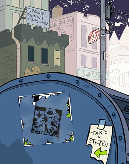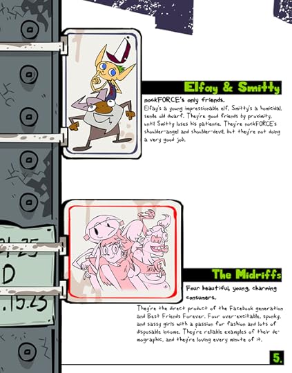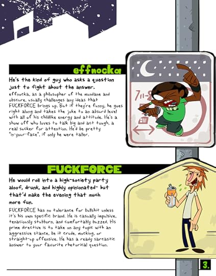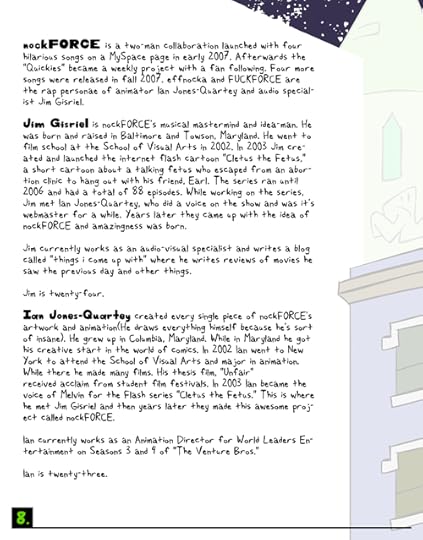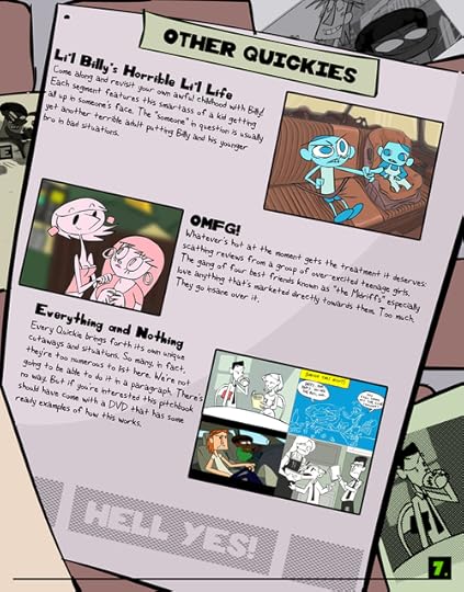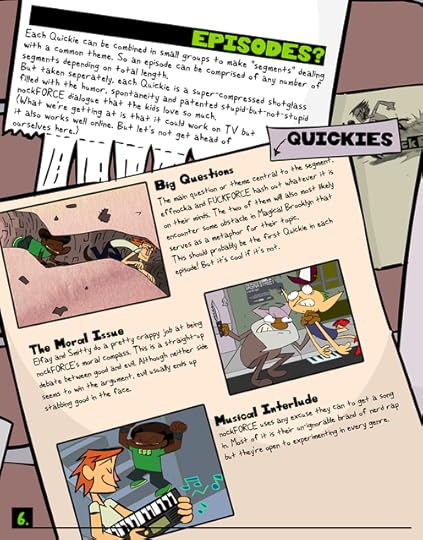 I was working at [the now defunct] World Leaders Entertainment in NYC as an animation director for Venture Bros at the time, and we signed a deal with them to develop nockFORCE as a TV series. If it was picked up, WLE would have produced new TV-quality full episodes. We shaped the existing material into a show format and pounded the pavement to several networks to see what they thought! The pitchbook was the end result of the development process and we were pretty proud of it. I still am actually. We even included a peel-off vinyl sticker on the inside cover!