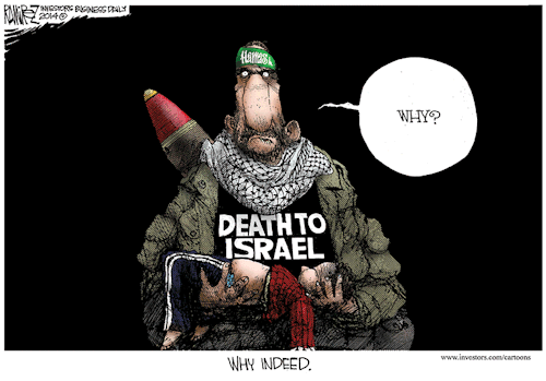 the reader is left to conclude that the answer to both questions is “because American weapons manufacturers need to make a buck.” Two good cartoons.