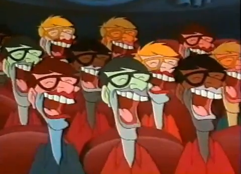 The theatre scene ends with a rather bizarre shot of a bunch of recolored clones laughing. These clones are a caricature of animator Eddie Fitzgerald.