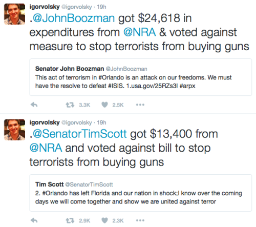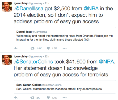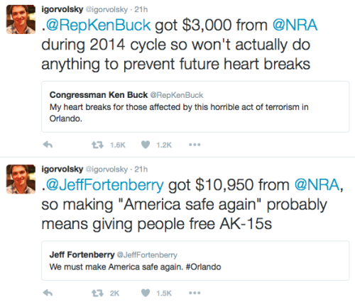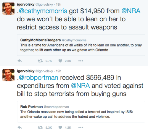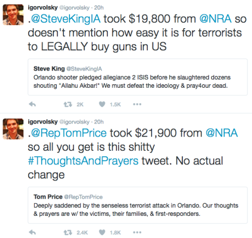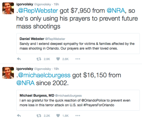 Igor Volsky, Deputy Director of the Center for American Progress Action Fund, spent much of yesterday calling out our lawmakers who claim to have thoughts and prayers for the Orlando victims but accepted money from the NRA. Ted Cruz’s tweet may have been the most hypocritical of all.