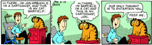 That up there? It is the very first Garfield comic. Look at it. It's a cat, and he wants to be fed by his owner. THAT IS SOME COMEDY GOLD RIGHT THERE.