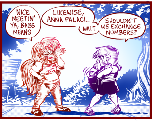This one is by Count Darkhugs ( @count-darkhugs ) & we made an explicit request for somethin’ with his cool OC Vanessa Cosgrave, who is the gal Anna’s havin’ a chat with. You can read many comics starring her at his website & his tumblr!