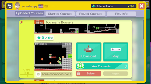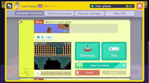 Planning to do one more stream late tonight ( http://twitch.tv/superhappybros/ ) where I play the levels of others, including people on my FL, some SA goons, at least one run through the random 100-mario challenge, and anyone who replies to this post with codes!