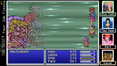 The Crystal Guardians… wellll… they were a problem. Four high-level bosses against a low-level party meant Dark Shock and other such Blue Magics wouldn’t land so easily this time. They actually have weak attacks until they lose a big chunk of their HP, when they start using spells that pretty much destroy the entire party in one shot. Indeed, a few reloads ended up happening with this boss. But the thing about FFV, and especially the Fiesta run, is trying every combination of things you can think of and eventually hitting upon the one that works. In this case, it was Graviga+Aeroga. The Time Spell Graviga seemed to have a much higher chance of landing than the Blue Spells, and it took off ¾ of their lifebar, leaving enough for one Aeroga hit to finish it off. Except for the Crystal that was a wind elemental. That one needed a few well-timed casts of Aqua Breath instead, and it was pretty scary, but they managed to do it. The need for grinding for EXP was successfully delayed once again.