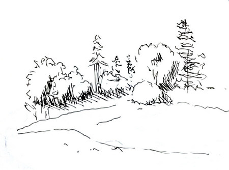 Sketching with pen places a lot of emphasis on line and contour. That’s ok, because we’ve always got watercolors to provide color, right? The problem with all this is that the pen sketch becomes an end product. You might think about watercolor while making a pen drawing but it’s still all about edges and contours.