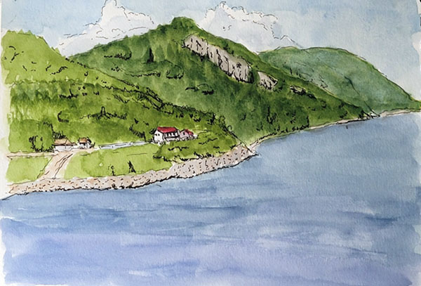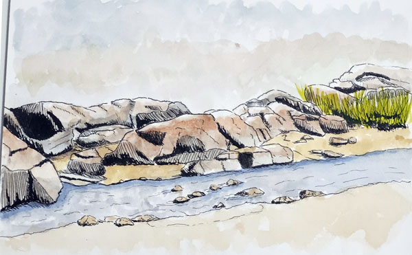 On another day, however, we went to “Port au Persil,” which is a small town with a gorgeous cove area and a pier where you can sit and watch whales. I got to see my first beluga whale which was exciting. Actually, we saw lots of them during our trip. By whale standards they’re quite small but they’re snow white and gorgeous. My sketchbook came out around the cove though. The cove is full of rounded sandstone rocks and I couldn’t resist. This reflects those formations.