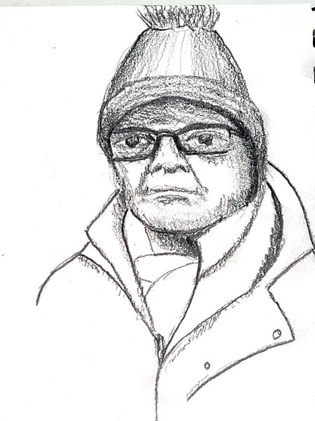 I don’t do portraits but who could resist sketching this guy, who sat down across from me in the park. I did take advantage of my wife’s patience as this one took more than five minutes, but not more than ten.