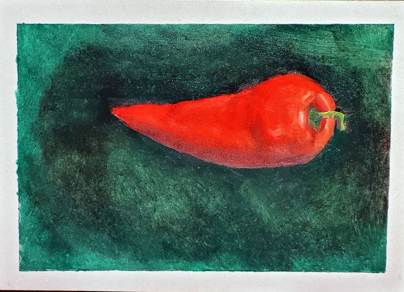 Here’s my first oil painting ever. It’s supposed to be a flying hot pepper just in case you can’t identify it. All I was trying to do was see if I could get some 3-dimensionality from oils. It’s painted on a 6×8 MDF panel.