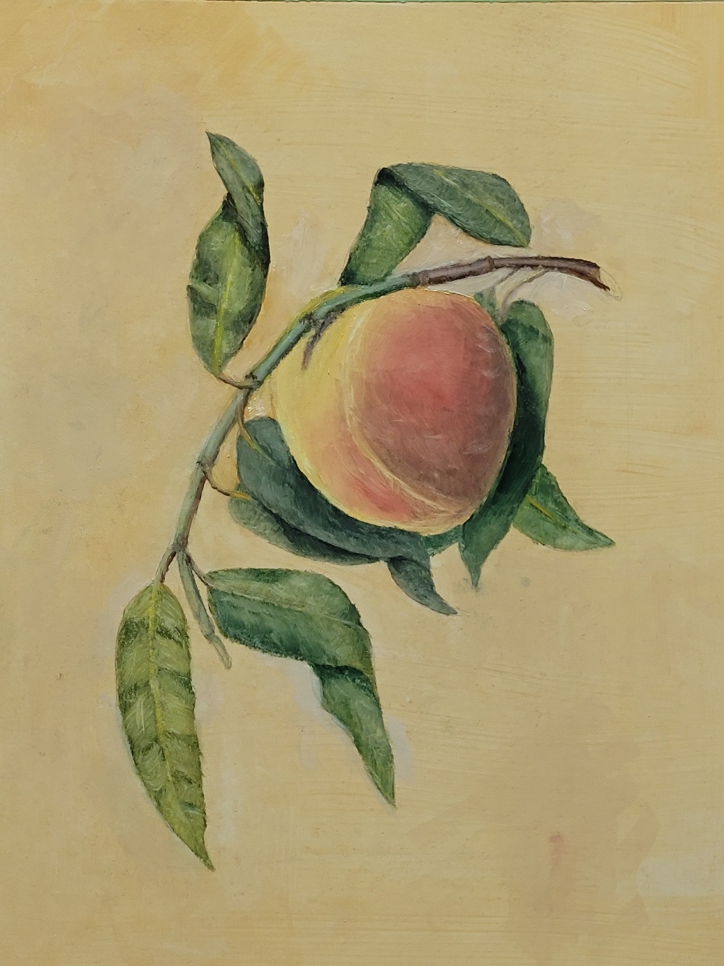 In spite of being a complete beginner with oils, I decided to try it. I drew the peach and its associated branch and leaves onto a 9×12 piece of MDF that I’d primed with gesso. I was off and running. The painting? That was more like being at the 20 mile point of a marathon only rather than hitting a metabolic “wall”, this wall was because I had no idea how to make oil paint fuzzy (grin).