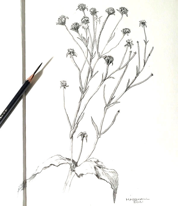 I did this on the day that Chantal was chopping down our flock of Cup plants. These are very tall, sunflower-like plants but with many smaller flowers than your typical sunflower. They get their name by the fact that each branching of the plant creates a “cup” that collects water and the plant absorbs it through soft tissue. Pretty cool they are and we enjoy them every year. Anyway, I took the top of one of them and drew it on the first page of my new sketchbook. A pencil drawer am me.