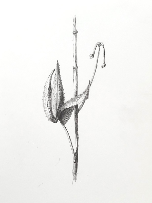 I was walking the other day and found some mushrooms on their last legs I did some tiny sketches of them. It was hard because they were old and falling apart. Somehow I related to them (grin). Anyways, the highlight was that I found some milkweed pods and I brought some home with me. This was done in my S&B Epsilon 9×12 sketchbook.