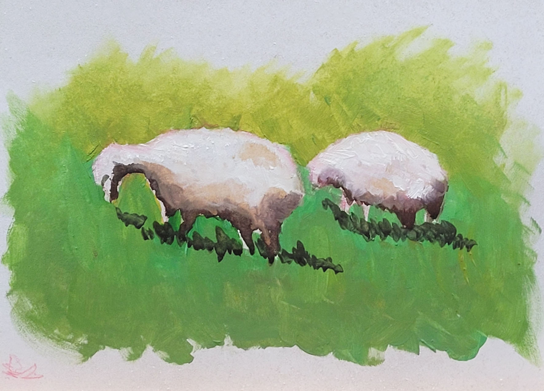I’ve been playing with the idea of doing small, quick paintings too, either with gouache or oils, experimenting with the idea of replicating what I would normally do with watercolors but doing the paintings direct with paint. Here’s one, based upon a watercolor done by Whee Teck Ong. I did this one by drawing, with paint, a single line along the back of the two sheep to position them and then I jumped in with oils to complete the sketch in less than 10 minutes. Not a milestone but this, and others, has convinced me that with red, yellow, blue, burnt sienna and white I can sketch on small panels once I gain better control over the medium.