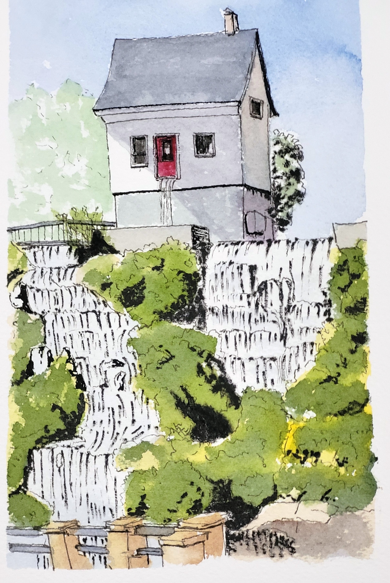 I sketched very quickly (some my say sloppily) and so I had time to throw a bit of color on it before she returned. I suppose this is a landmark sketch for me as it’s the first in a very long time. Hopefully I can get back to a daily routine. If there’s one thins COVID and my bad knee has taught me it’s the power of routine to keep your skills up. Mine are way down right now. Feels real good, though, to click on Location Sketching as a tag for this sketch.