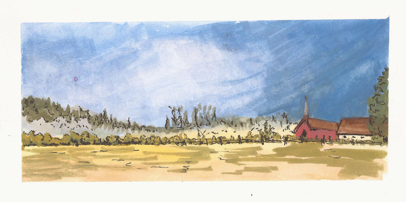 I went off the deep end the other day and did a simple landscape painting in gouache. There was no under drawing. There was no planning. And most of all, there was nothing to look at because we’re buried in snow here in Quebec. I NEVER DO STUFF like that. Maybe it’s the cold I have or maybe it’s the “self-isolation” and “social distancing” I’m doing but I did it and here is the result.