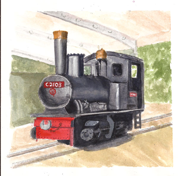The other day I was drawing, in my typical pen and ink style, a small steam locomotive. I was enjoying myself when my brain went off dreaming. It started thinking about painting that locomotive in gouache. They say that if you’re going to dream, dream big and this was a whopper.