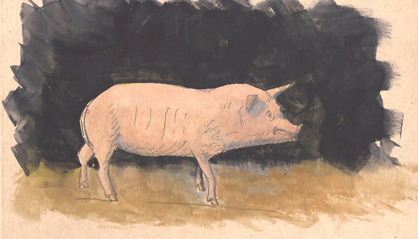 I’ve been sketching a bunch of Schleich animal figures I have collected. These are beautiful models. While small, they don’t move. Some of the sketches were done in pencil, some in pen. Some have been done quickly, while others were done more carefully. It’s been fun but more a matter of doodling than sketching. Here’s a pig that I did with pen and gouache. This one was done in a sketchbook I made from Strathmore Toned Tan (184lb) paper.