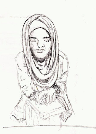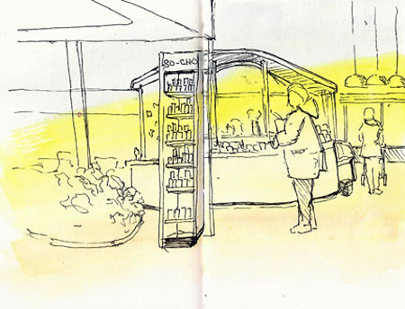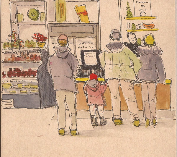 This scene was created by drawing people as they arrived at this kiosk, followed by drawing some of the kiosk clutter for background.