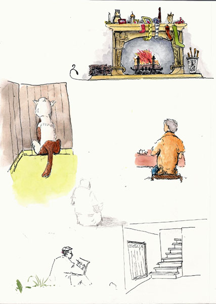 With winter upon us we’re into cold weather sketching routine, which means doing things indoors. Still, we like to sketch together and so, every year, we reserve a room at our local library and draw/paint Christmas cards. I’m not much of a card giver but this event is a lot of fun.