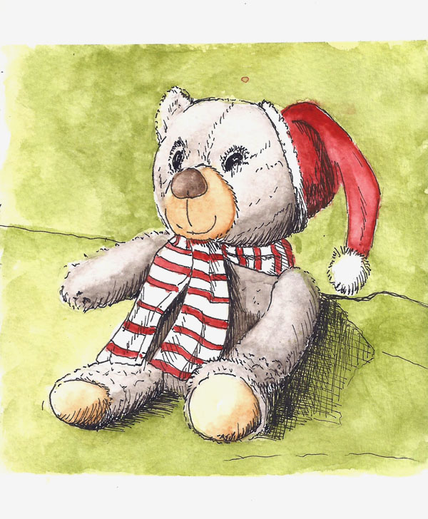 Denise had set up several objects for us to draw. One of them was a small teddy bear in Christmas garb and he proved popular with those of us sketching. Here’s my attempt.