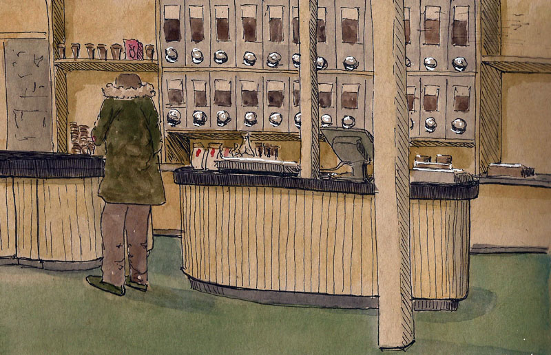 For this one the approach was a bit different because my goal was to draw the end of a long coffee shop so I started with the big shapes of the counters. A guy came along and stood while he poured milk and sugar into his coffee (from counter on the left) so I drew him and then went back to drawing all the “stuff” that was coffee shop.