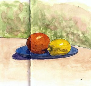 Jodie and I sat down in the kitchen to draw one morning. She was drawing flowers from one of my botanical art books and I grabbed an orange and lemon, dropped them on a plate and did this rather poor rendition that I title “Orange and Lemon.”