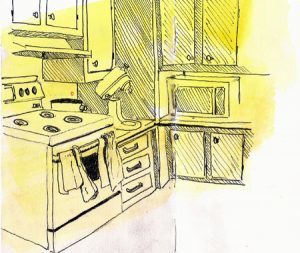 One afternoon, Jodie and Chantal decided to make a fancy cake. I think they felt challenged by the two batches of cookies and bread I’d baked (grin). As I sat watching I started sketching the kitchen. This is as far as I got.