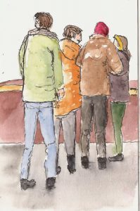 I met my buddy Yvan at the market for a bit of sketching people. The people movement was hectic but I did a couple pages like this. I’ve said before that I’m not a fan of people sketching but this is the only reliable sketching target for us in the winter.