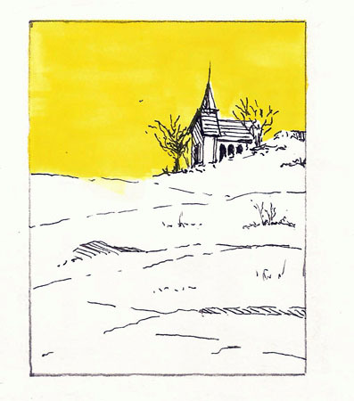 One morning I just started sketching an old-time imaginary church on a hill. It was fun to just doodle some sparse scenery around it.