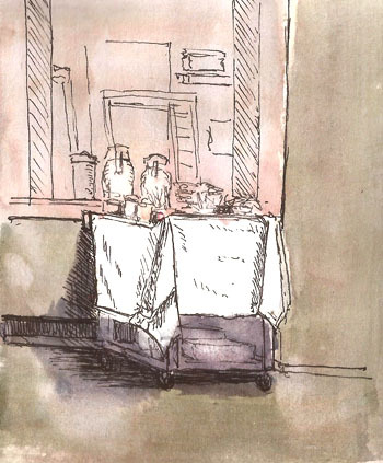 I moved to a different location and found a condiment cart sitting next to a wall and decided to draw it. I always find it hard to “draw” all the little bits, trying to generate instead a series of textures to represent them. In the end I think the sketch was too small to worry about it. It was fun to get out with pen in hand. Did I mention that I need practice…lots of practice.