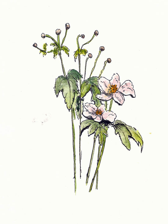The silly thing is that I thoroughly enjoy sitting in the yard with all my concentration directed at a bunch of leaves and flowers I know little about. Chantal tells me these are anemone flowers. I know nothing about cultivated plants except they’re fun to draw as long as you don’t have the attitude that they’re “always there.”