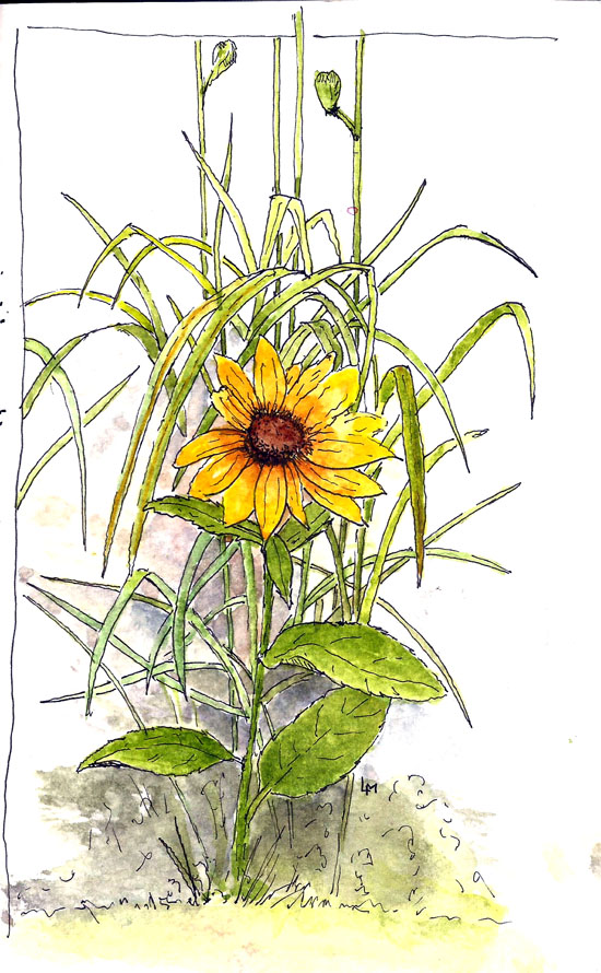 Yes, it has encroached upon the garden, invaded our space. It sits proudly, head up and says “What’cha gonna do about it?” Well, we’ve adopted it and it’s one of our favorite features in the backyard, if only for its audacity. I had to draw it – our single Rudbeckia. Where it came from we do not know. But it’s here and its our weed and we love her.