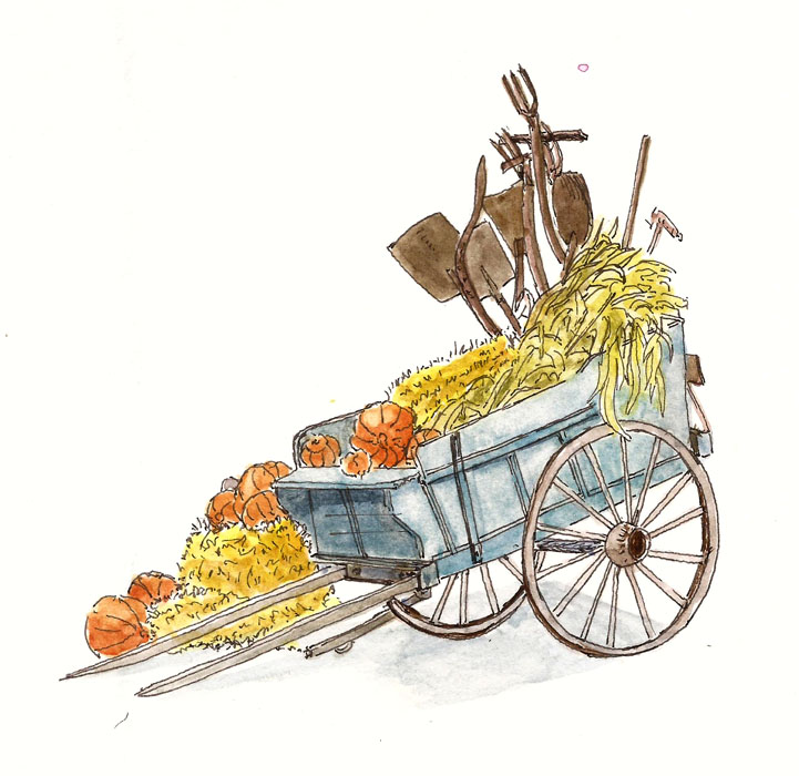 When I saw this display I had to sketch it. Great scene, though unfortunately it was placed into a shaded area next to the entrance of our farmers’ market. This was not the most photogenic placement of a rustic cart so I didn’t draw any of the background. Hope that’s ok (grin).