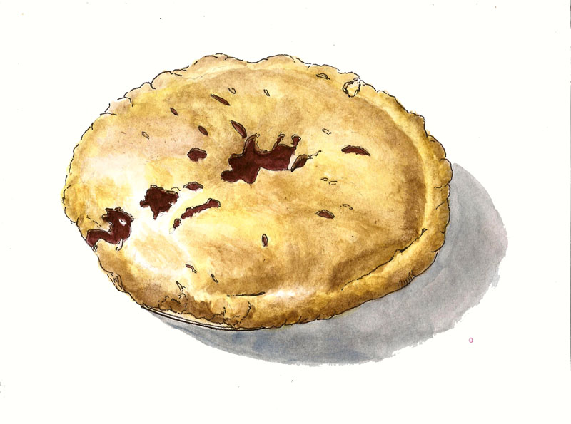 Chantal made a pie the other day and I decided I should paint it. This was one of those wacky experiments as I’m not much of a watercolorist. I’d like to be but mostly I just color in the spaces of my ink sketches. I was happy with my pie experiment though. The pie was good too.
