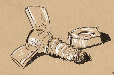 I thought I’d add a few of my doodles along with this sketch. This is where I practice stuff. In this case I was trying different degrees of “looseness” in my pen lines, trying to match the subject at hand. I’m not sure I accomplished any of that but I added just a bit to my pen mileage and every bit helps.