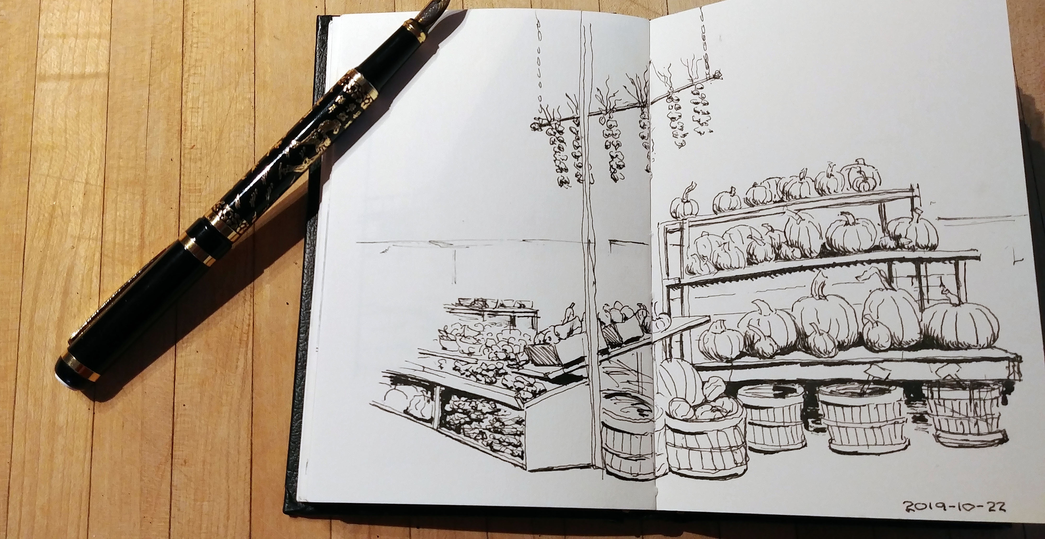Our Grand Marche is awash in pumpkins. I’m sure there are more apples in the building but pumpkins are a close second. Not drawing some of them is simply out of the question. Doing this drawing along with a cup of coffee made for a fun, even relaxing morning.