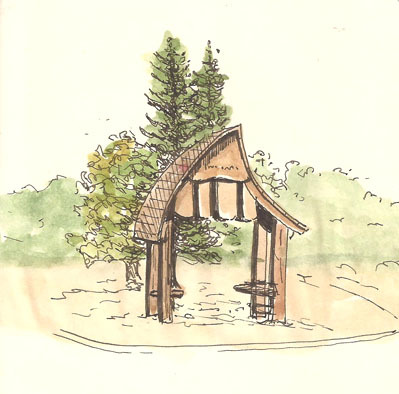 Eventually the rain stopped and I sat down to quickly sketch this odd structure. It was small and part of a children’s playground. Its total height couldn’t have been more than eight feet and all it had available for kids were two shallow tables. I assume that there are some toys to play with on those tables during the summer but none were in evidence when I was there. Still, it was cute as could be so I did this quick sketch.