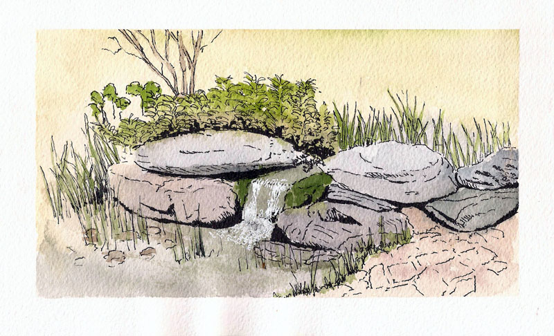 I chose to draw a really tiny waterfall that connects two small ponds near the entrance to the garden. I started by covering the paper with some blotches of color to match the subject and then wandered around the garden while that dried. I really like the idea of doing paint first but I’m not sure I’ve got the patience to deal with the drying time. Eventually it did dry and I started drawing with DeAtramentis Document ink. More watercolor was added to finish the drawing. It’s a fun way to work, except for the drying time, so I’ll probably do it again.