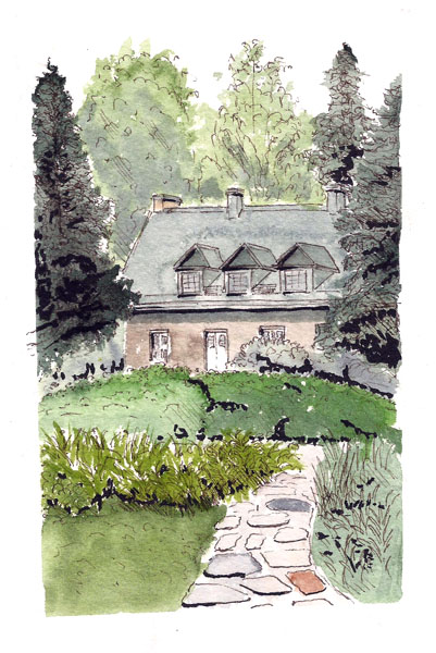 My first sketch was an example of me biting off more than I could chew. It didn’t start out that way. I intended to draw just the end of a long set of Quebec equivalents of New York brownstones. These are covered with gables, towers, etc. and are quite stunning. They’re also quite complicated. Very quickly, though I let my eyes grow big while my time stayed the same and the result was that very soon I was scribbling my way to depicting half of the entire complex, something that should have taken twice the time and been done in a much larger format. My little 4×6 book just wouldn’t hold it all. Here it is, serving as a lesson – when you decide the scope of a drawing, stick to it.