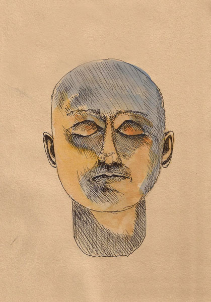 My first stop was the 3d mask exhibit I talked about at the beginning of the month. I went there with our sketching group and while my hands were less than happy about it, I drew one of the masks. I confess to a certain frustration drawing these masks and I think I’ve figured out why. I’ve been trying to turn them into a real face, when in fact they are somewhat alien because the tops of the head are removed, the eyes closed, and in general they’re just too smooth everywhere. So, I figured I’d go with the flow on this one, producing the alien creature that it is, exaggerating it a bit with watercolor. The mask is lit from below and excepting that it’s white rather than blue, this is pretty much what it looks like. Kinda spooky don’t you think?