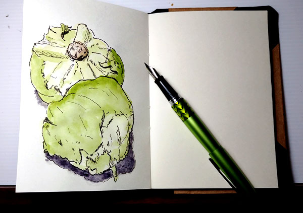 Stillman & Birn Beta (10×7), Pilot Kakuna, DeAtramentis Document Black, Daniel Smith watercolors