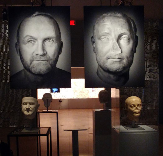There’s a new exhibit at our Museum of Civilization that plays right into my new endeavor to learn how to use a pencil while drawing portraits. It’s called Mon Sosis a 2000 Ans which means, I think, My 2000-Year Old Double. While there’s some variation in how it’s presented, most of the displays look like this one (left). On the right is a head (or bust) from long ago and far away (many are Egyptian or Greek). On the left is the result of scanning a person’s head and using the results to 3D print a mask of the person’s face. The pictures above show you what the person looks like with a comparative photo of the ancient sculpture.