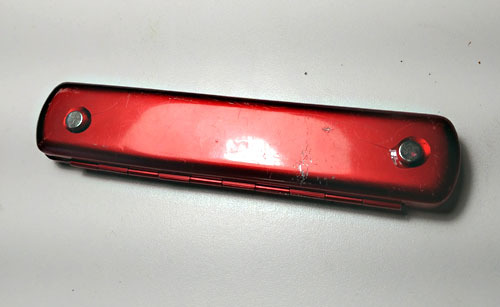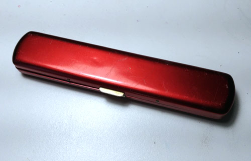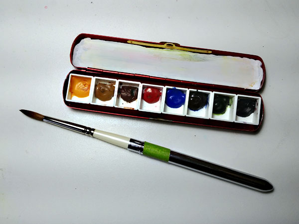 Unlike the traditional Altoids box, this one is made from a case for reading glasses. As such, it’s long and thin and I think it might fit my particular needs. To “create” it all I did was paint the lid with white acrylic paint and stick 8 half pans into it using blue-tack. Instant tiny palette.