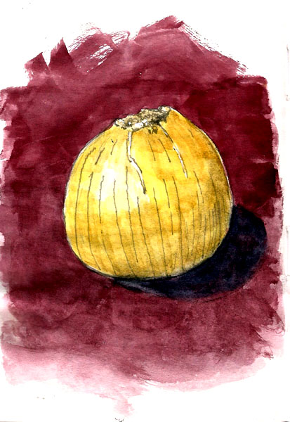 I’ll leave you with this simple, poor drawing of an onion. I did a simple, lumpy outline and then did the paint, adding some more lines when everything was dry. It was done in my quick-sketch (ie – cheap) notebook and it was like painting on a blotter but I enjoyed the fact that shapes were being made, which is the important thing.