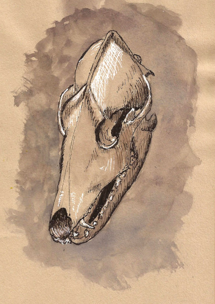 My hand was hurting a bit, but my real problem was that I’d lost my ability to “see.” Nothing was automatic and I struggled to see the shapes and volumes of the coyote skull I decided to draw. I should have chosen something more simple. I guess I should have known that “out of practice” would include all aspects of drawing, but I figured that once I trained my brain, it would stay trained. Then again, I forget where I put my keys so… Anyway, here’s my version of a coyote skull, which has an eye socket drawn way too small.