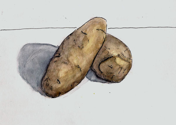 I’ve drawn apples, bananas, garlic, pumpkins, peppers, etc. (we get lots of snow), but I’ve never drawn a potato. Following in Tina’s footsteps, today I drew a potato, or rather two potatoes since that was the road less traveled.