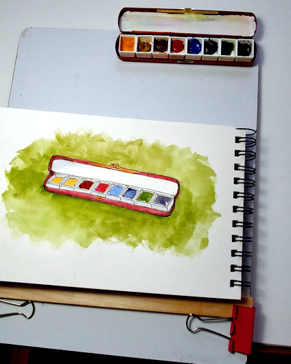 I don’t know why but we urban sketchers are almost obsessed with the notion of creating tiny palettes. I’ve made a bunch of them, though each time I’m disappointed, mostly because there’s not enough mixing area and I find them difficult to hold compared to my larger palette that has a nifty ring on the back I can shove my thumb into.