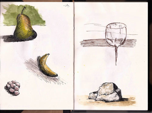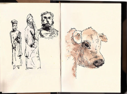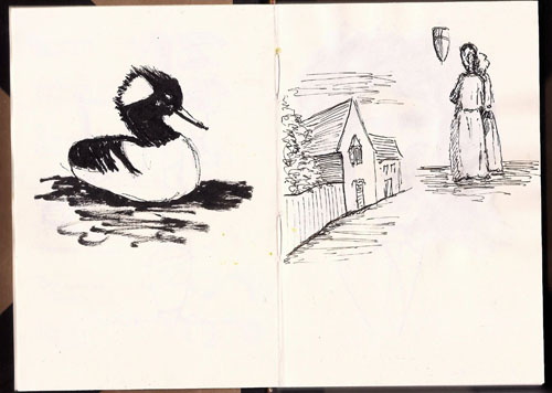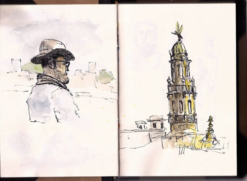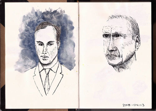 It’s hard knowing what to write in this blog because, well, the sketching opportunities are few and far between right now. I’m heading to Montreal this weekend for the USK Montreal monthly sketchcrawl. That’ll be fun. In the meantime I thought I’d share with you the latest ten pages from my “scribbler.” This is Marc Taro Holmes’ term for the little sketchbook that every sketcher has (right?), where we doodle constantly. My current scribbler is nicer than my habit as I’m using the Emilio Braga notebook that I talked about not long ago and I love it. Scribbler sketches don’t generally see the light of day but maybe they should. What do you think? I guess that’s a subject for another blog.