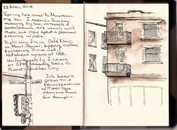 The next morning my daughter had an exam and I had time to kill before Notabene, my favorite store in Montreal opened. I also needed breakfast and so I went to Cafe Noir, a little coffee place near one of the Metro stations. Killing an hour, alone, in a coffee shop almost requires a pen be scraped across paper and so I started making some notes about my visit. This led to drawing street lights and the top of the building across the street. I didn’t make it to the bottom because with bagel and coffee consumed, it was time to head off to Notabene.