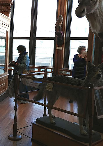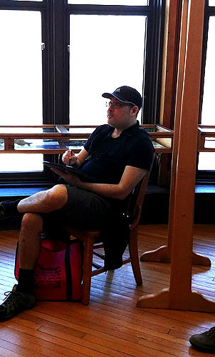 I love this museum. It’s structured like an old-time natural history museum and has all the mahogany it needs to pull it off. I was standing here (photo above) when Marc called to tell me he’d arrived and very shortly, we were catching up, had arranged lunch, and then we decided to draw, which was the raison d’etre of the event after all. Notice that Marc isn’t properly armed with watercolors, pencils and pen. He’s drawing on an iPad.