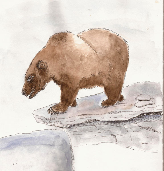 I started with a grizzly bear. It was a disaster and I include it here only as an example of sketching gone wrong. I got the bright idea to try wet-in-wet while sitting on a tripod stool in a museum and with my extensive background of never having tried it before. Eeeeeekkkk! I wet the entire bear. I can’t say whether I wet it too much or too little as I had a hard time seeing just how much water was on the paper in the subdued lighting. What I do know is that when I started dropping in browns, I created something more akin to the big bang than a painting. There was brown exploding everywhere and in an instant I had a bear-shaped outline that looked like something that came from the south end of a cow. I quickly started dabbing at it. I’m sure the other patrons thought I was under attack by some invisible creature as I flailed around. As I said, it was/is a disaster.